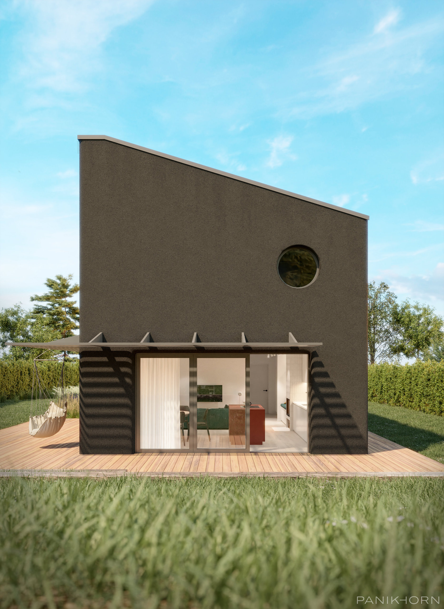Fasáda dostala hrubou strukturu tmavé břízolitové omítky, která z jednoduchého objemu vytváří tichý monolit v krajině.